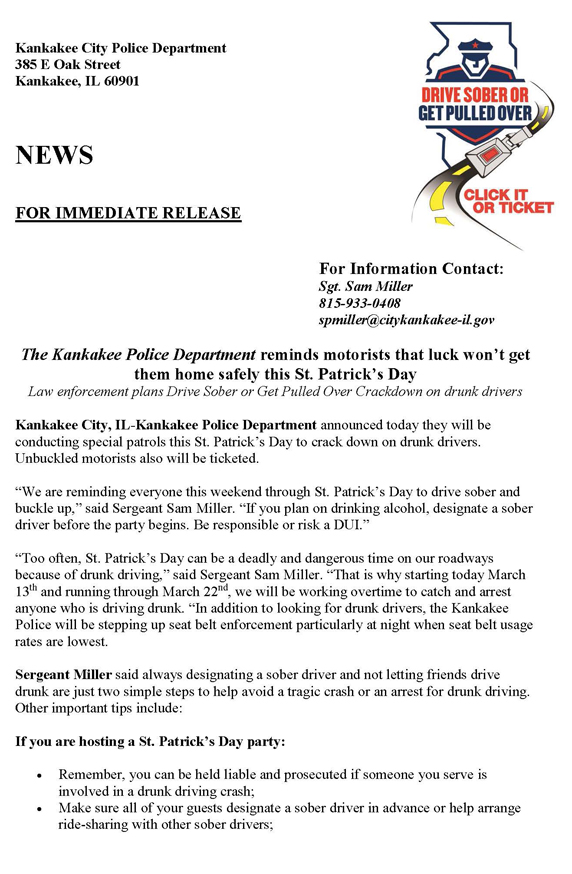 Kankakee City Police joined forces with other state and local law enforcement and highway safety partners in the Illinois St. Patrick’s Day campaign. The campaign featured high-visibility enforcement combined with a variety of outreach activities which included a strategic media campaign as well as additional enforcement activity.