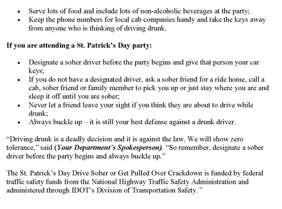 This law enforcement crackdown was funded by federal traffic safety grants through IDOT’s Division of Traffic Safety and is part of the statewide “Drive Sober or Get Pulled Over” and “Click It or Ticket” campaigns.