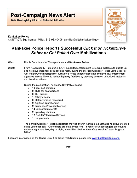 From May 9-26, 2014, IDOT supported law enforcement agencies statewide to remind motorists to buckle up both day and night during the Click It or Ticket seat belt enforcement mobilization. Kankakee Police joined other state and local law enforcement agencies across Illinois in this annual effort to get more motorists to buckle up, in the front and back seat - and save more lives.